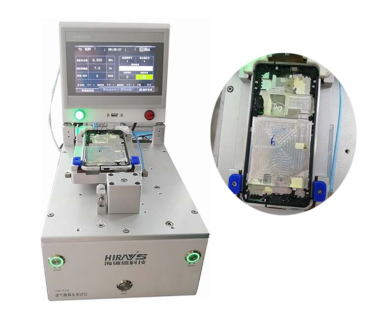 本設(shè)備采用真水測(cè)試的方式,通過自動(dòng)真水檢測(cè)儀推動(dòng)真水作用在手機(jī)咪孔、平衡孔的防水 透氣膜上,經(jīng)過一段時(shí)間后,由儀器檢測(cè)密閉腔體內(nèi)有無水滴,如無,則相當(dāng)于檢測(cè)區(qū)域內(nèi)是無水汽的;如有水滴,則將水滴轉(zhuǎn)成水汽,檢測(cè)密閉墻體內(nèi)水汽的量,對(duì)比密閉腔體內(nèi)無水汽時(shí)有一個(gè)很明顯的變化。